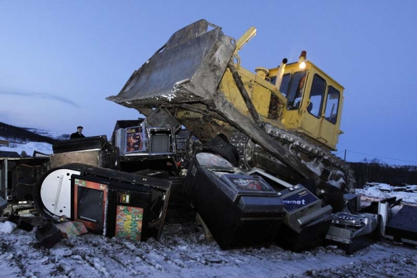В Кузбассе по решению мирового суда пустили под бульдозер игровые автоматы, изъятые в подпольных игорных залах. Два с лишним десятка «одноруких бандитов» вывезли на специальный полигон Междуреченска, и за несколько минут трактор раскатал по земле игровые автоматы общей стоимостью в несколько сотен тысяч рублей.